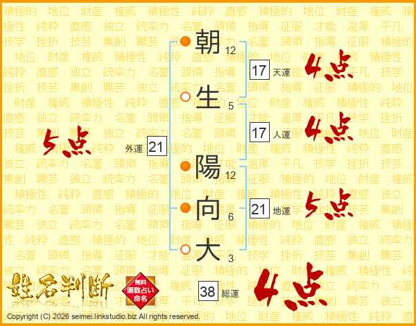 朝(12画)生(5画) 陽(12画)向(6画)大(3画)
