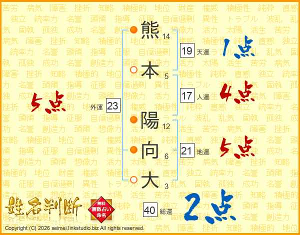 熊(14画)本(5画) 陽(12画)向(6画)大(3画)