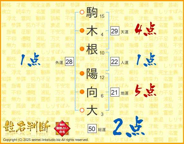 駒(15画)木(4画)根(10画) 陽(12画)向(6画)大(3画)