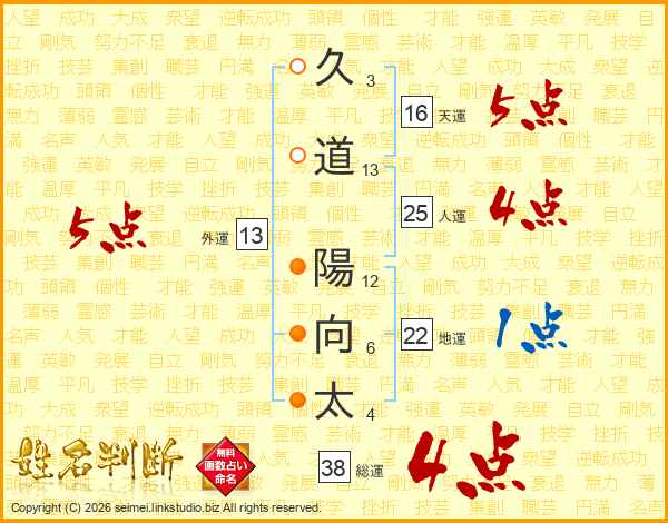 久道陽向太さんの総運は38画の4点!