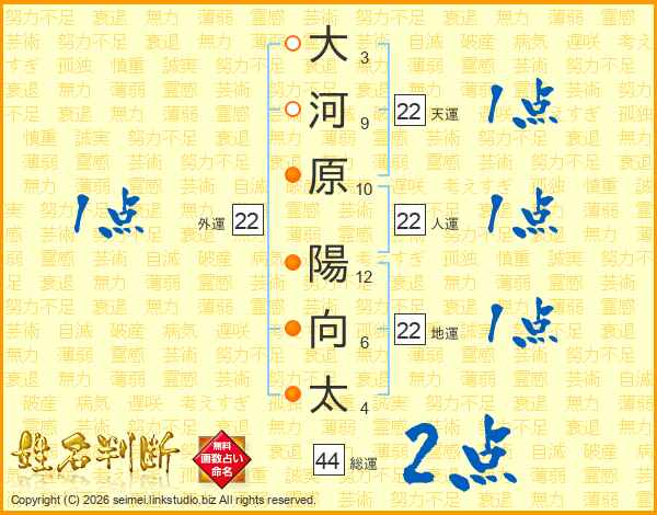 大(3画)河(9画)原(10画) 陽(12画)向(6画)太(4画)