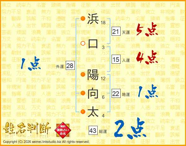 浜口陽向太さんの天運は21画の5点!