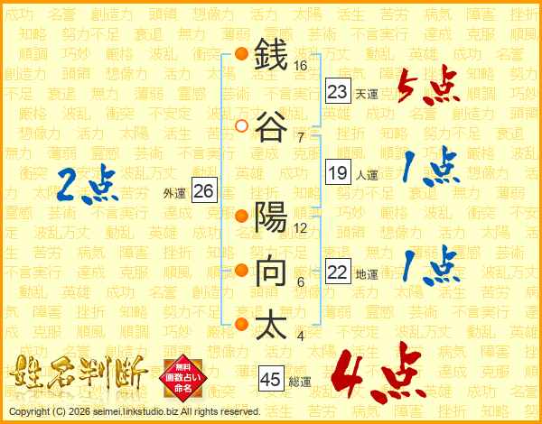 銭谷陽向太さんの総運は45画の4点!