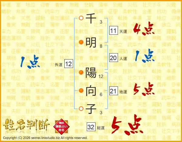 千(3画)明(8画) 陽(12画)向(6画)子(3画)