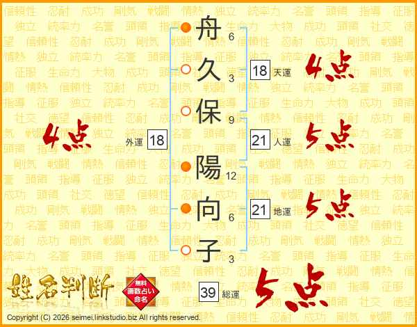 舟(6画)久(3画)保(9画) 陽(12画)向(6画)子(3画)