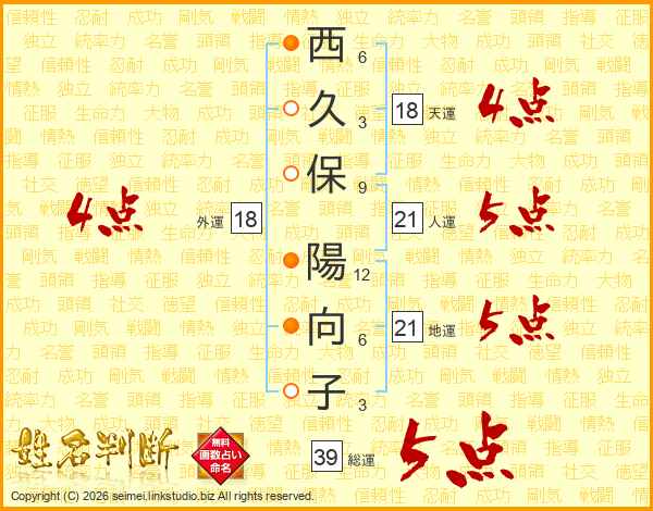 西久保陽向子さんの総運は39画の5点!