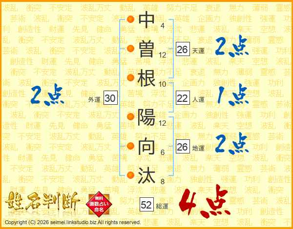 中(4画)曽(12画)根(10画) 陽(12画)向(6画)汰(8画)