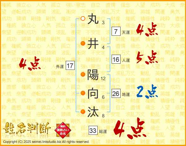 丸(3画)井(4画) 陽(12画)向(6画)汰(8画)