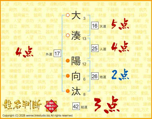 大(3画)湊(13画) 陽(12画)向(6画)汰(8画)