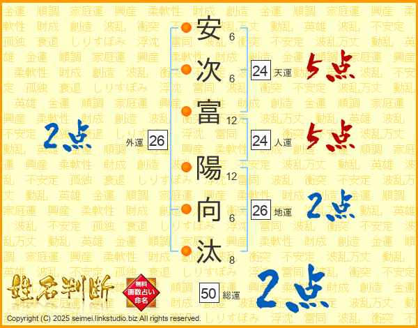 安(6画)次(6画)富(12画) 陽(12画)向(6画)汰(8画)
