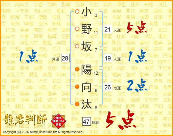 小(3画)野(11画)坂(7画) 陽(12画)向(6画)汰(8画)