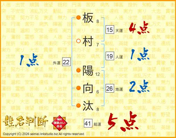 板(8画)村(7画) 陽(12画)向(6画)汰(8画)