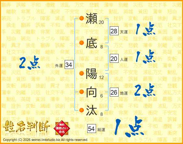 瀬(20画)底(8画) 陽(12画)向(6画)汰(8画)