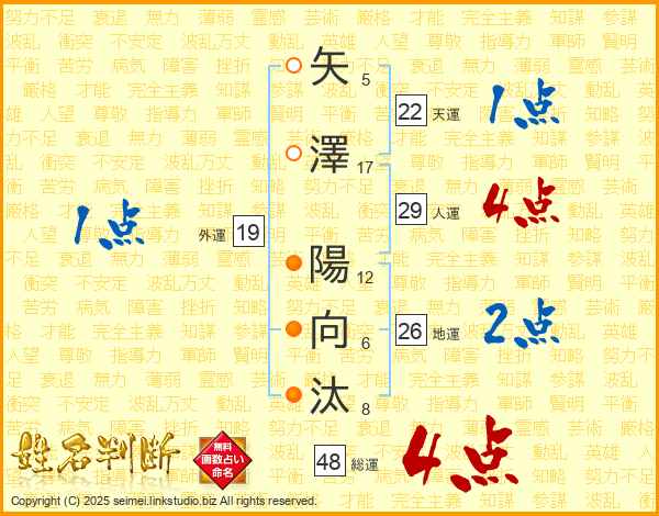矢(5画)澤(17画) 陽(12画)向(6画)汰(8画)
