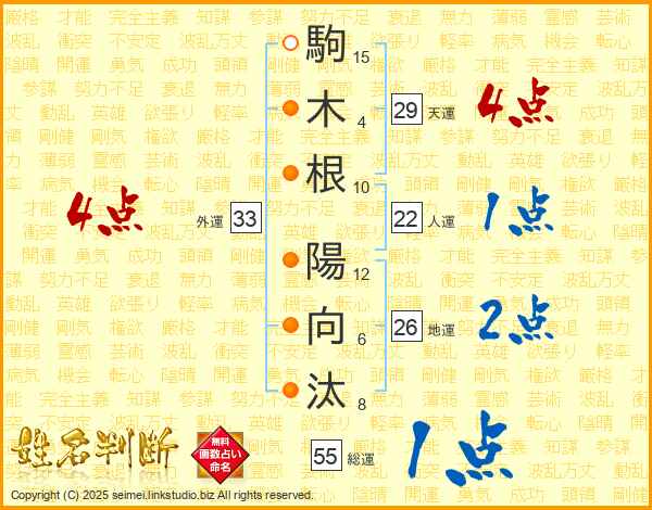 駒(15画)木(4画)根(10画) 陽(12画)向(6画)汰(8画)