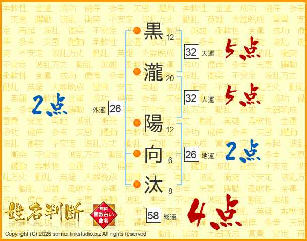 黒瀧陽向汰さんの総運は58画の4点!