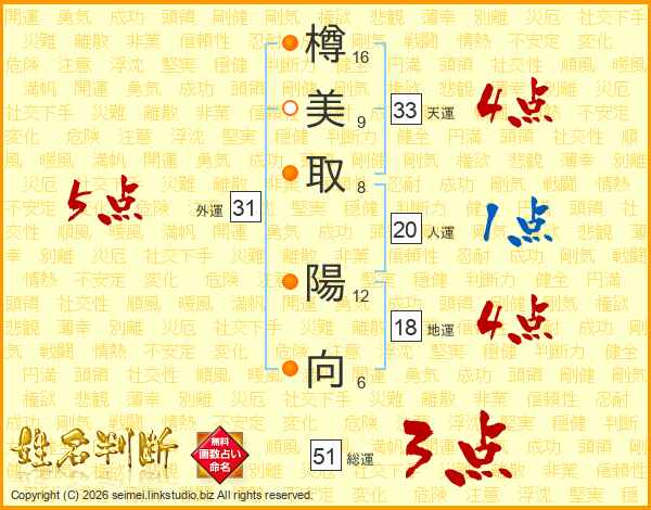 樽(16画)美(9画)取(8画) 陽(12画)向(6画)