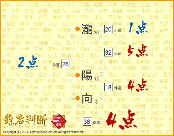 生活面を象徴する運勢です。外部から受ける影響力を表し、結婚運、家庭運や職場、環境への順応性を表します。総運から人運を引いた画数。姓や名が1文字の場合を除く。