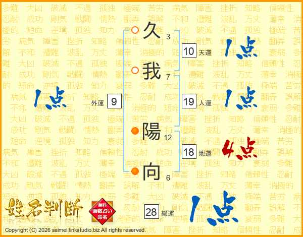 生活面を象徴する運勢です。外部から受ける影響力を表し、結婚運、家庭運や職場、環境への順応性を表します。総運から人運を引いた画数。姓や名が1文字の場合を除く。