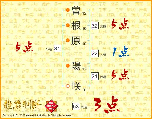 曽(12画)根(10画)原(10画) 陽(12画)咲(9画)