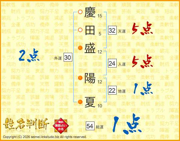 慶(15画)田(5画)盛(12画) 陽(12画)夏(10画)
