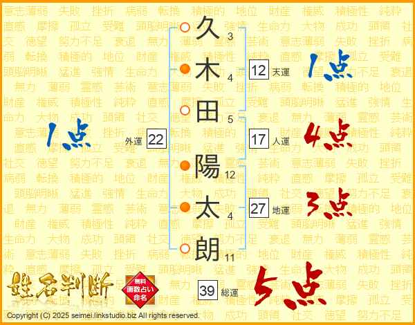 久(3画)木(4画)田(5画) 陽(12画)太(4画)朗(11画)