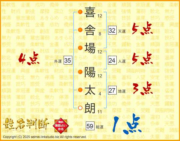 喜(12画)舎(8画)場(12画) 陽(12画)太(4画)朗(11画)