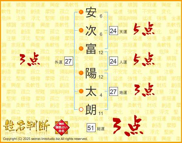 安(6画)次(6画)富(12画) 陽(12画)太(4画)朗(11画)