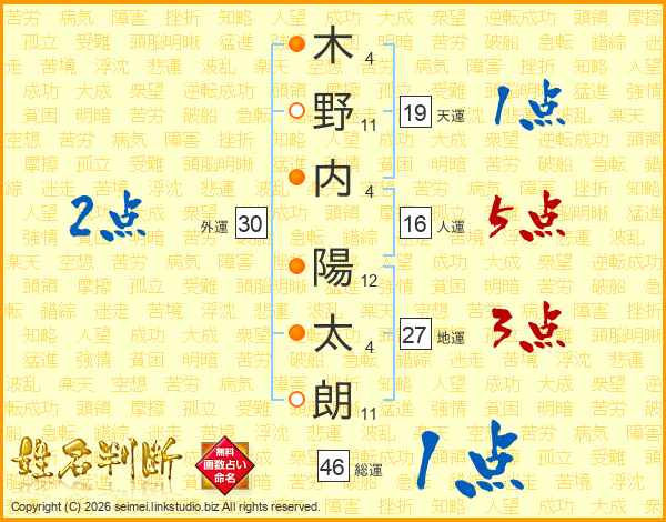 木(4画)野(11画)内(4画) 陽(12画)太(4画)朗(11画)