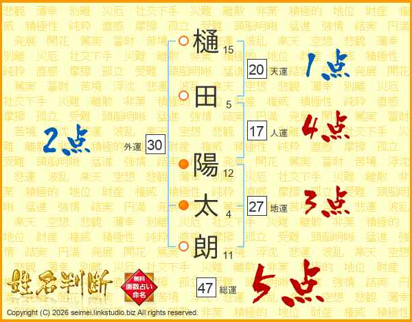 樋(15画)田(5画) 陽(12画)太(4画)朗(11画)