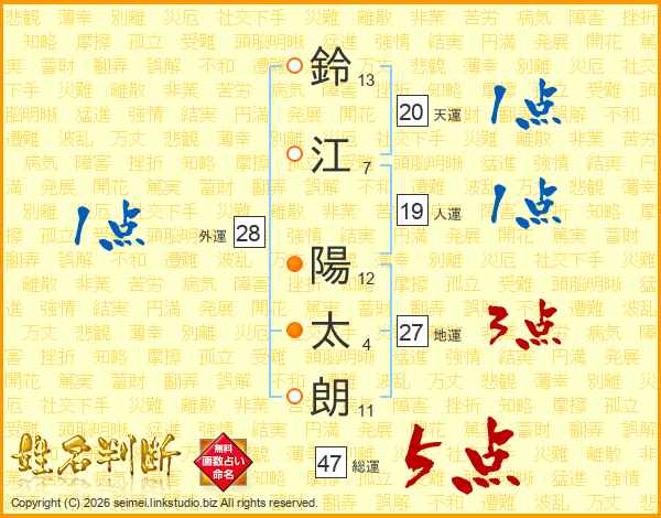 鈴(13画)江(7画) 陽(12画)太(4画)朗(11画)