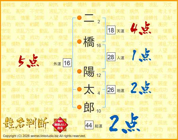 二(2画)橋(16画) 陽(12画)太(4画)郎(10画)
