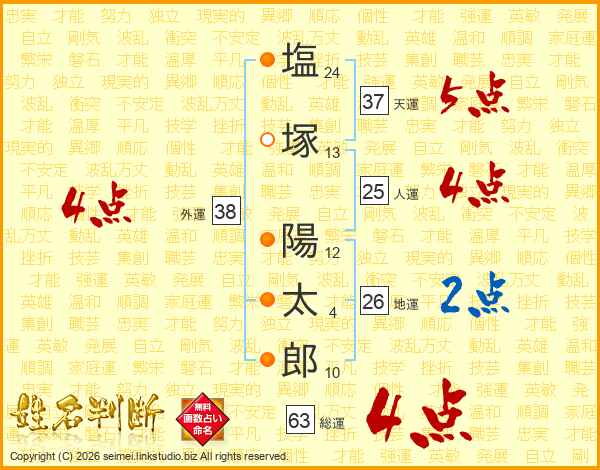 塩(24画)塚(13画) 陽(12画)太(4画)郎(10画)