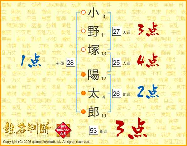 小野塚陽太郎さんの天運は27画の3点!