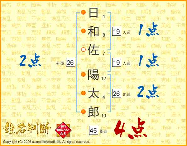 日(4画)和(8画)佐(7画) 陽(12画)太(4画)郎(10画)
