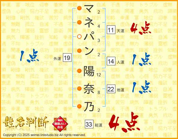 生活面を象徴する運勢です。外部から受ける影響力を表し、結婚運、家庭運や職場、環境への順応性を表します。総運から人運を引いた画数。姓や名が1文字の場合を除く。