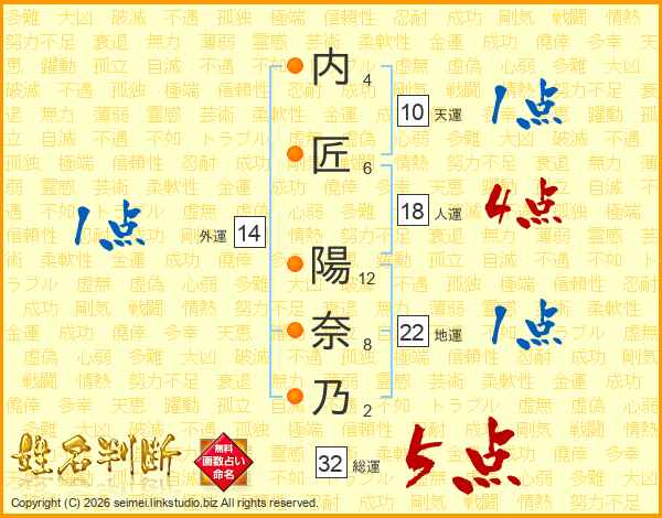 内(4画)匠(6画) 陽(12画)奈(8画)乃(2画)