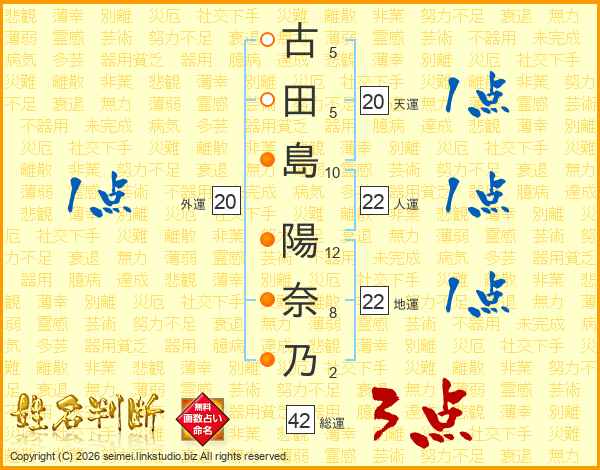古(5画)田(5画)島(10画) 陽(12画)奈(8画)乃(2画)