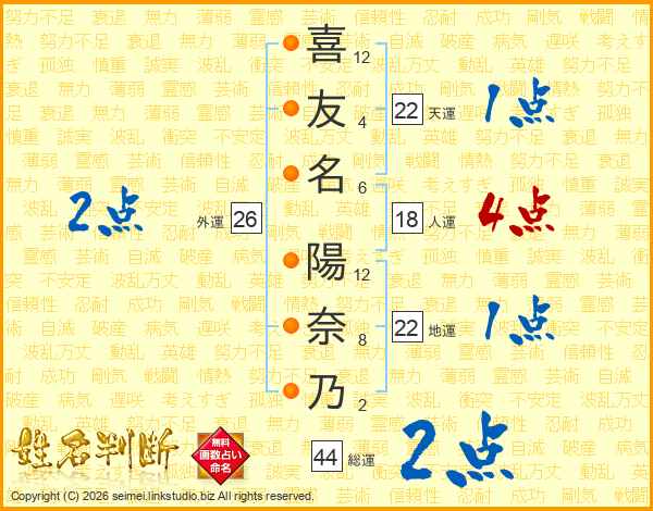 喜(12画)友(4画)名(6画) 陽(12画)奈(8画)乃(2画)