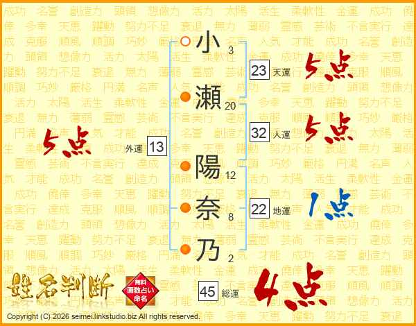 小瀬陽奈乃さんの総運は45画の4点!
