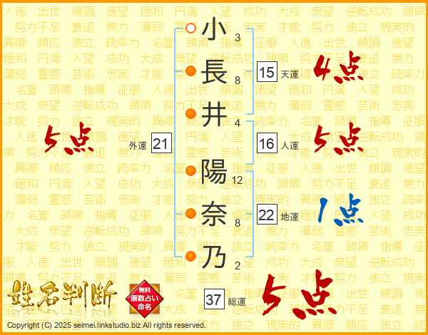 小(3画)長(8画)井(4画) 陽(12画)奈(8画)乃(2画)