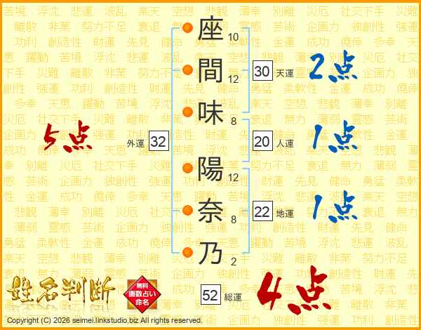 座(10画)間(12画)味(8画) 陽(12画)奈(8画)乃(2画)
