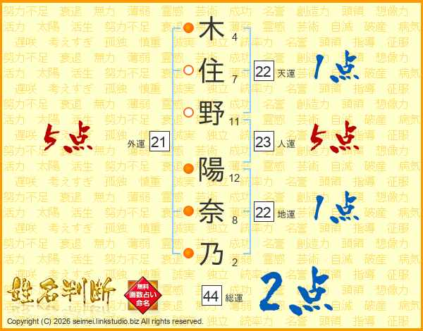 木(4画)住(7画)野(11画) 陽(12画)奈(8画)乃(2画)