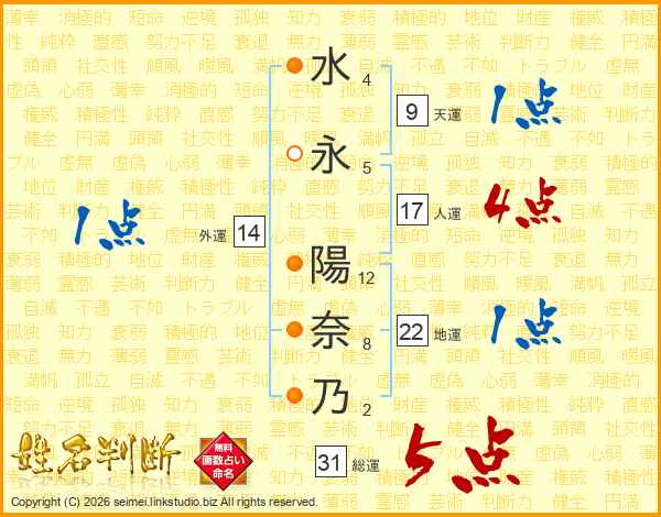 水(4画)永(5画) 陽(12画)奈(8画)乃(2画)