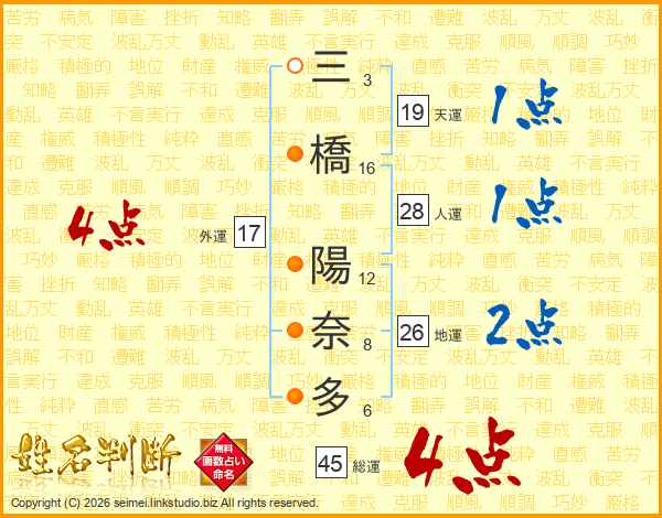 三橋陽奈多さんの総運は45画の4点!