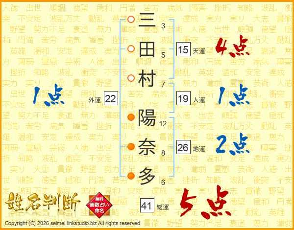 三(3画)田(5画)村(7画) 陽(12画)奈(8画)多(6画)