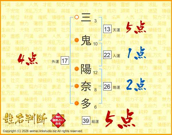 三鬼陽奈多さんの総運は39画の5点!