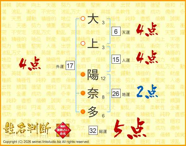 大(3画)上(3画) 陽(12画)奈(8画)多(6画)