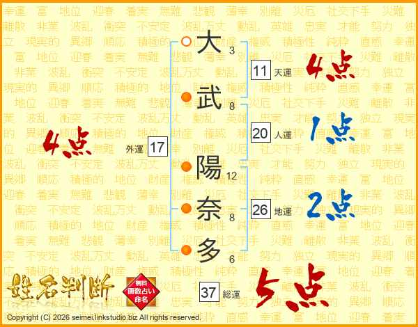 大(3画)武(8画) 陽(12画)奈(8画)多(6画)