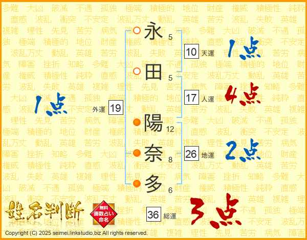 永(5画)田(5画) 陽(12画)奈(8画)多(6画)
